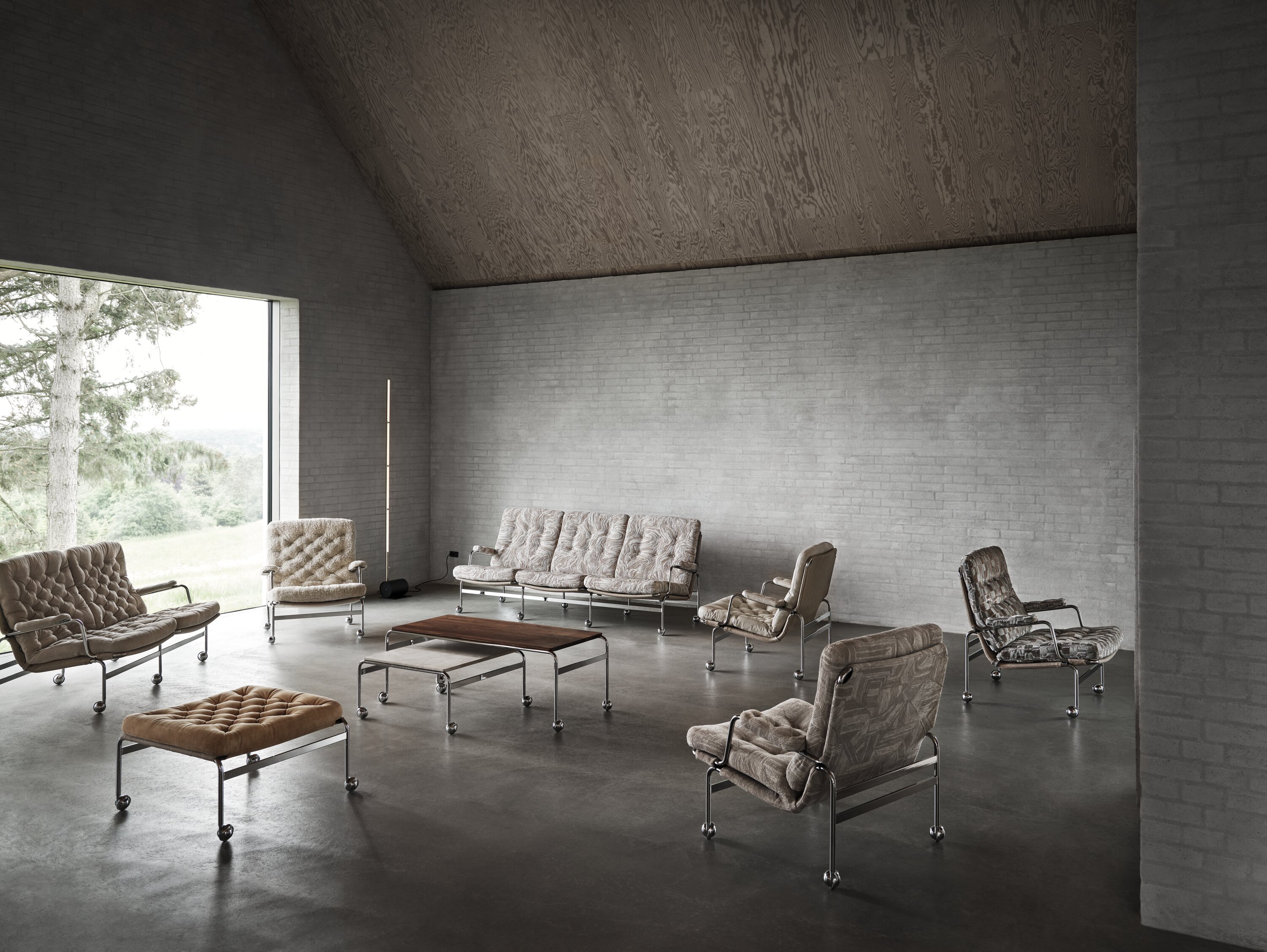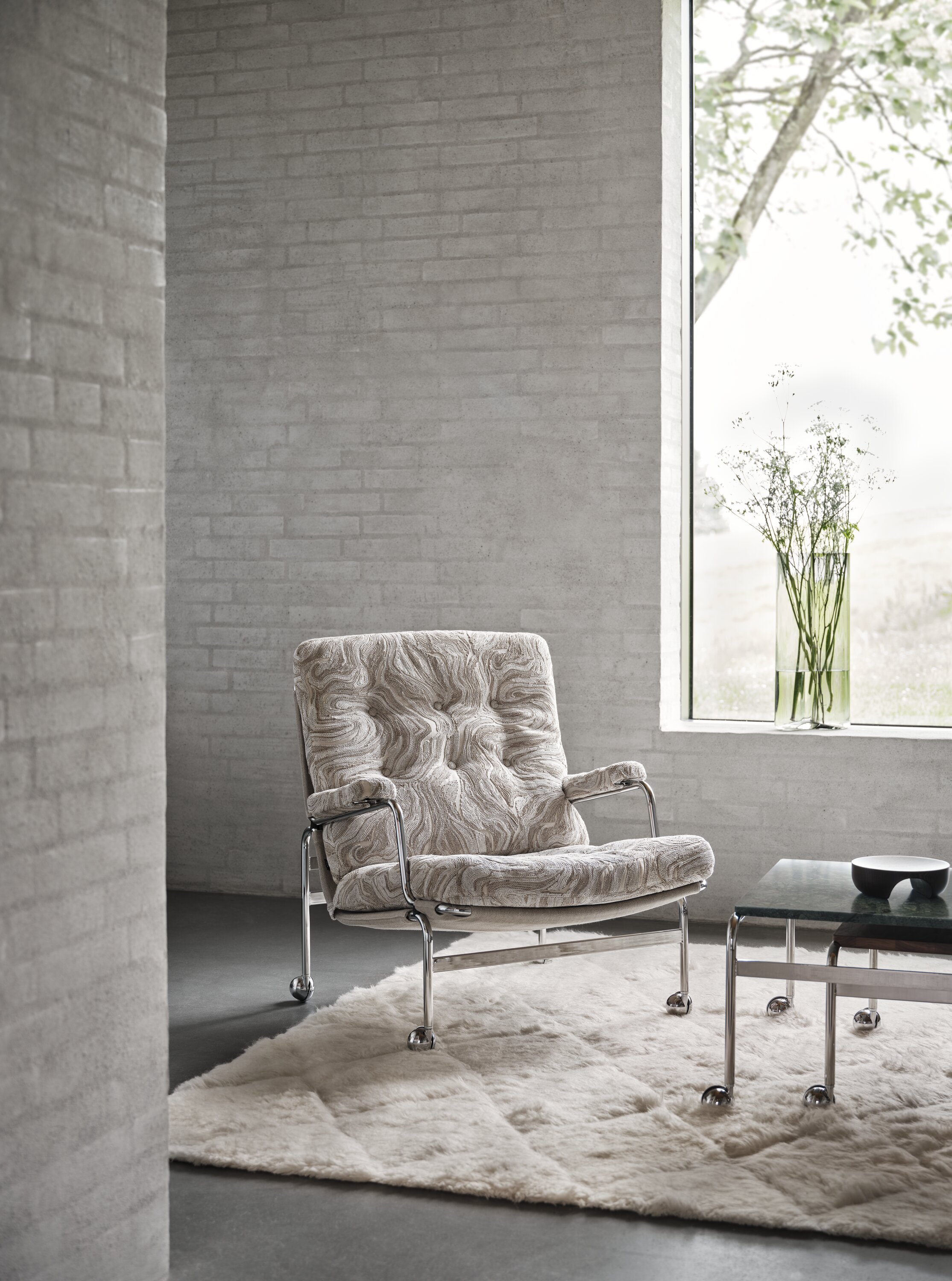 This classic elegant armchair was designed by Bruno Mathsson in 1969 and was the first item of furniture in a successful collaboration that lasted for several decades. Comfortable stuffed cushions rest on a chrome-plated frame with supporting web. The Karin range also features a stool and table.